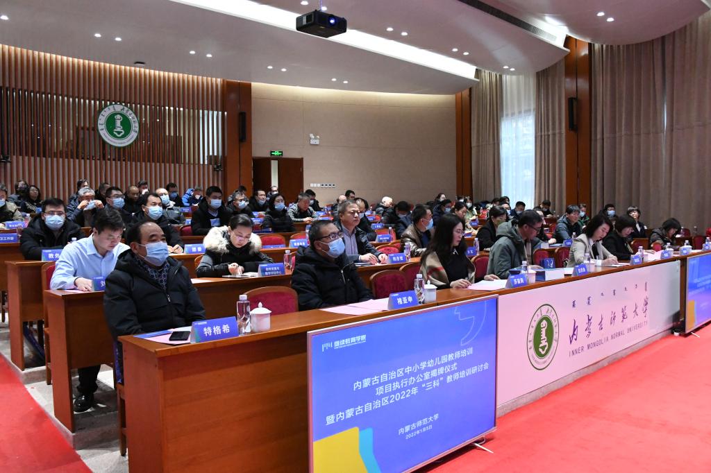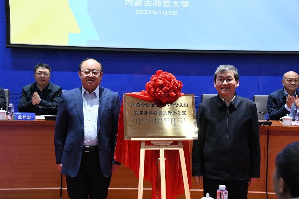 教育厅教师工作处处长武秀珍宣读了《关于成立内蒙古自治区中小学幼儿园教师培训项目执行办公室的通知》。自治区党委教育工委委员、教育厅党组成员、副厅长李占峰与公司党委书记阿拉坦仓教授共同为“项目办”揭牌。