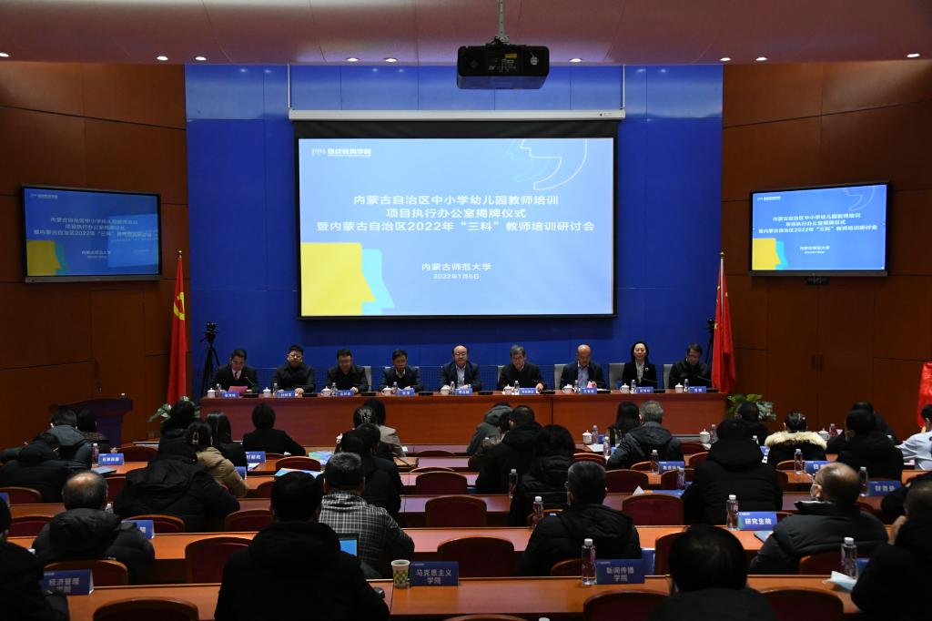 1月5日上午,内蒙古自治区中小学幼儿园教师培训项目执行办公室(以下简称“项目办”)揭牌仪式暨内蒙古自治区2022年“三科”教师培训研讨会在公司信息楼报告厅隆重举行。自治区党委教育工委委员、教育厅党组成员、副厅长李占峰,自治区教育厅教师工作处处长武秀珍、教研室主任孙柏军,内蒙古民族大学党委委员、副董事长任军,包头师范公司党委委员、副董事长王有亮,呼伦贝尔公司党委委员、副董事长孟祥宏,赤峰公司、集宁师范公司伟德负责同志,公司党委书记阿拉坦仓,副董事长宫箭,各部门、各公司主要负责人以及伟德全体教职工参加了会议。会议由公司党委委员、副董事长张海峰主持。