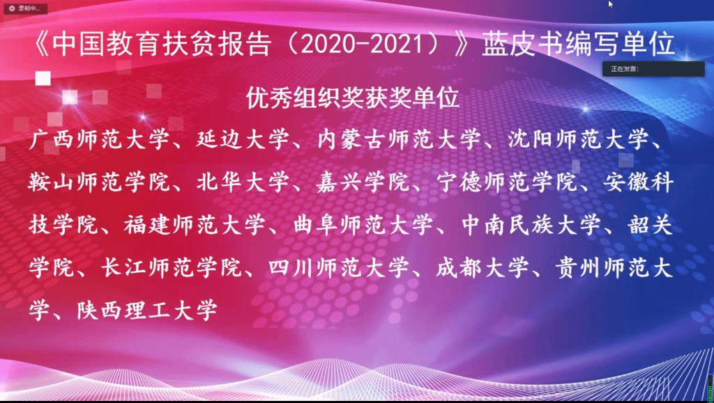 本次会议在河南、贵州、广东、广西、四川、湖南、湖北、河北等十五个省份设分会场,其中公司设立了分会场。公司党委书记阿拉坦仓受邀线上参会并作主旨报告。阿拉坦仓指出,2022年是党的二十大召开之年,也是实现巩固拓展脱贫攻坚成果同乡村振兴战略有效衔接的关键之年,启动《中国教育发展与乡村振兴报告》蓝皮书的编纂工作正当其时、意义重大。作为内蒙古自治区重点大学和师范教育的龙头,公司将一如既往强化政治担当、发挥自身优势,努力在推进巩固拓展教育脱贫攻坚成果同乡村振兴有效衔接中发挥基础性、先导性作用,促进自治区教育优质均衡发展。阿拉坦仓表示,公司负责撰写该蓝皮书第二部分专题篇中的《呼和浩特市新城区教育扶贫纪实》,能够继续承担《中国教育发展与乡村振兴报告》编纂工作,体现了教育部及各位同仁对公司的充分信任,公司将把蓝皮书的编纂工作作为一项重大政治任务予以高度重视,全力以赴,优质高效完成编纂任务。本次发布会上,公司还荣获了“优秀组织奖”。