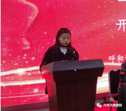 呼和浩特市回民区县府街小学教育集团班主任教师梁晓玲代表全体学员向承办会议的领导、专家和老师表示衷心的感谢。她说,这次国培不仅为广大班主任开辟了一个广阔的教研天地,也提供了一个可以学习和借鉴的平台,老师们可以从中得到更加专业、更加系统、更加科学的指导和帮助。参加培训的老师们一定会严格遵守培训纪律,明确学习目标,认真听课,深度参与培训研讨,潜心研修,强化自我管理,促进自身发展。