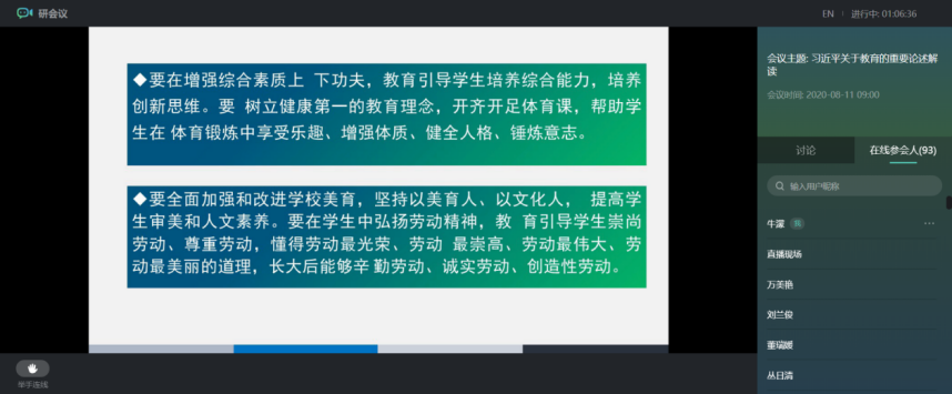 8月12日,“国培计划(2019)”——内蒙古自治区教师培训团队研修项目(师德、党务培训者)第五次线上课程在中国教师研修网学习平台上播出。伟德官方网站党委副书记、硕士生导师高云峰受邀为参训学员讲授了《习近平关于教育的重要论述解读》专题。
