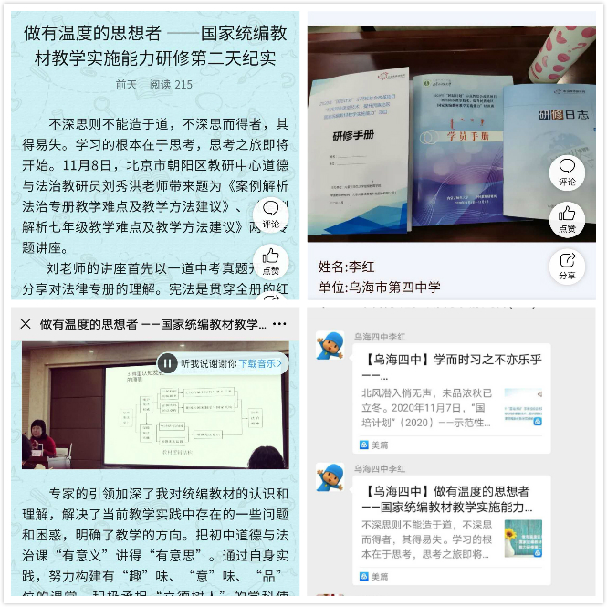 线下集中培训结束后,乌海市第四中学李红老师在美篇中写到,本次培训中专家的引领加深了我对统编教材的认识和理解,解决了当前教学实践中存在的一些问题和困惑,明确了教学的方向。把初中道德与法治课“有意义”讲得“有意思”。通过自身实践,努力构建有“趣”味、“意”味、“品”位的课堂,积极承担“立德树人”的学科使命,让真善美的种子在员工心中生根发芽。努力成为员工成长中的重要引路人,用心去教,用情去教。同时激励自己不断提高自身的专业性,努力做有情怀有理想的好教师。