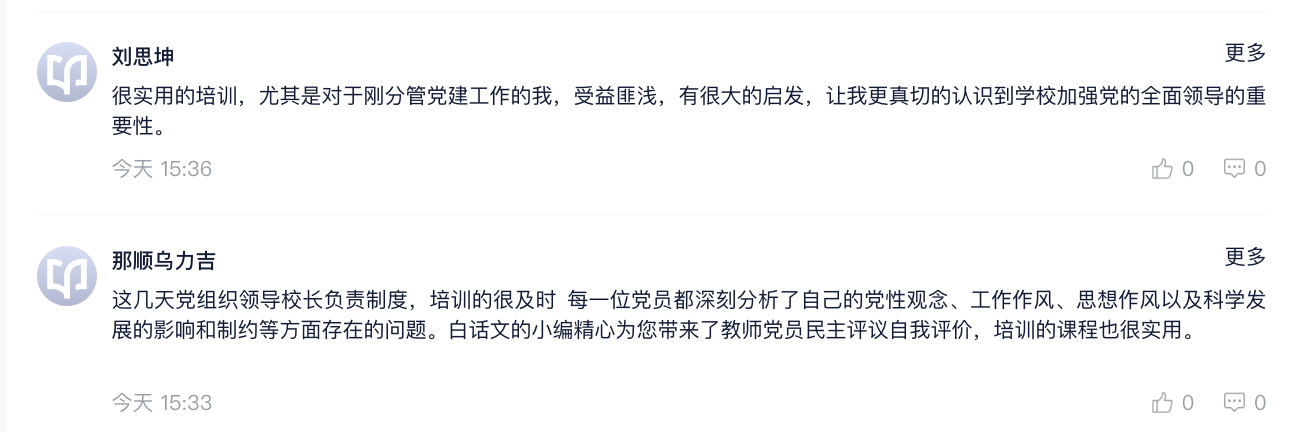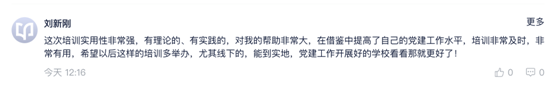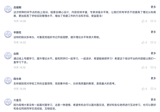 在两批总共为期10天的直播过程中,所有参训老师都积极参与每场直播的研讨及互动,针对公司党建工作及自身工作中的问题,提出了许多建设性的意见及建议,并表示培训结束后,将会结合所在公司的实际情况,将培训知识转化为实践的智慧,巩固和丰富培训成果。
