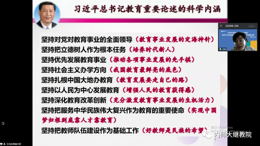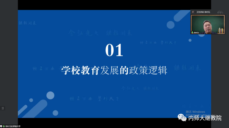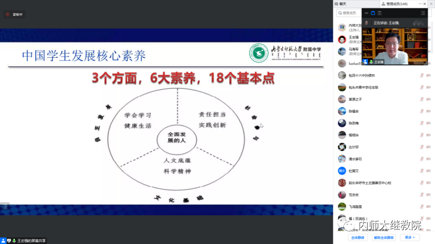 本次线上集中授课阶段于11月4日至9日进行,期间邀请了国务院特殊津贴专家、西南大学副董事长陈时见教授,西北师范大学教育公司李瑾瑜教授,伟德官方网站附属中学董事长王志强教授,呼和浩特市回民中学党委书记、董事长张威等十二位区内外知名专家、知名中学董事长,以专题讲座的形式先后讲授了“习近平关于教师的重要论述解读”“义务教育阶段董事长标准解读”“铸牢中华民族共同体意识”“深入学习贯彻党的二十大精神”“公司教育发展的政策逻辑与改进路径”“立德树人——新时期课程改革的新使命”“家校共育与校园安全”“赋能与成长——关于教育的一些思考和实践”“中学党建工作与业务工作的有效融合”“校园文化与校园治理”“中学教师职业行为准则与师德师风”“办‘有文化’的公司:理念、问题与策略”“国家通用语言文字核心素养”等专题。