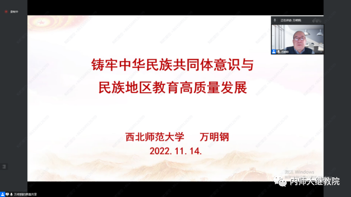 本次线上集中授课阶段于11月14日至23日之间进行,期间邀请了教育部全国民族教育专家委员会委员万明钢教授,北京市教育科学研究院原经理、党委副书记季明明研究员,河北师范大学教师教育公司田宝军教授,教育部国培项目入库专家王富军等区外知名专家学者,以专题讲座的形式分别讲授了“铸牢中华民族共同体意识与民族地区教育高质量发展”“以党的二十大精神为指导,努力构建中小学高质量教育体系”“培训需求调研分析与培训方案研制及培训课程开发”“做新时代的研训师”等十八个专题。