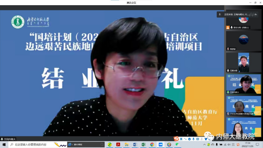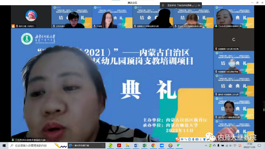 会上,王利经理首先代表内蒙古自治区中小学幼儿园教师培训项目执行办公室和伟德bevictor向全体学员表示热烈祝贺。她说,“国培计划(2021)”——内蒙古自治区边远艰苦民族地区幼儿园顶岗支教教师培训项目是针对边远艰苦地区幼儿园教师的顶岗培训项目,由于疫情原因转为线上实施,虽有诸多困难,但在四个旗县教育局的大力支持和各位学员的积极配合下,在公司领导的精心统筹和班主任的认真管理下,项目圆满画上了句号。 王利经理指出,本次培训项目系统性强,环节多,包括80学时网路研修、5天线上云跟岗和6天线上集中面授,虽然时间跨度较长,但学员参训率达99%。通过培训,学员在思想政治素养、职业能力和专业水平上有了极大的提升,达到了预期的培训目标。最后,她对全体学员提出了三点希望:希望各位学员在培训结束后,能够学以致用,提质增效,充分发挥作为幼儿园骨干教师的示范、引领和带动作用;希望各位学员继续保持联系、沟通分享、深化感情,实现资源共享;希望各位学员积极建言献策,助力伟德官方网站培训事业的建设与发展。