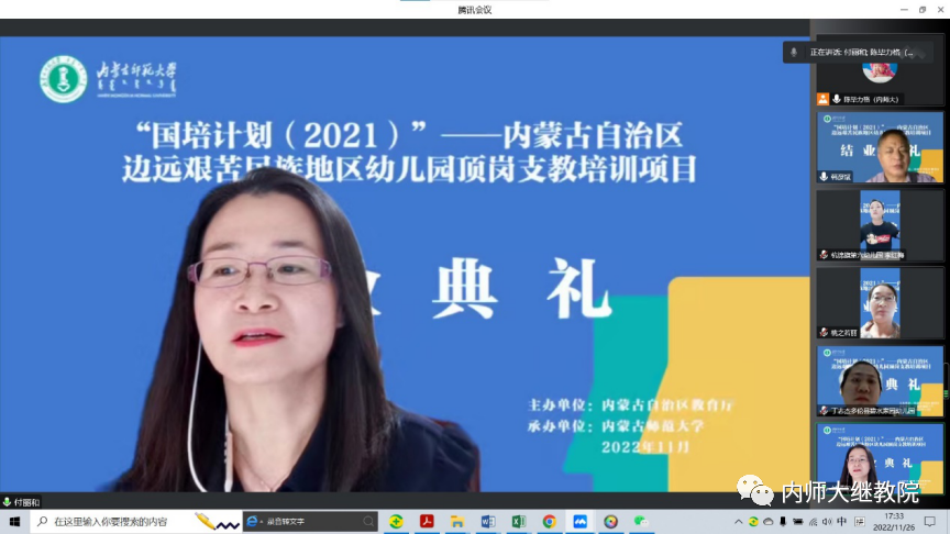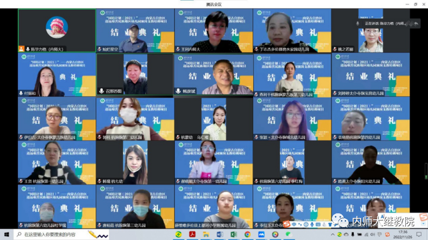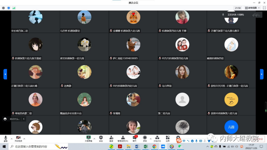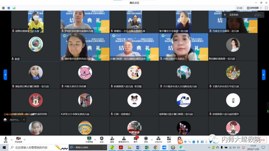 11月26日下午,由自治区教育厅主办、公司伟德具体组织实施的“国培计划(2021)”——内蒙古自治区边远艰苦民族地区幼儿园顶岗支教培训项目在线上举行了结业典礼,至此该项目顺利结束。公司党总支书记韩彦斌,党总支副书记、经理王利,党总支副书记、副经理刘云剑,副经理召那苏图,三位班主任高丽桃、陈毕力格、敖登以及锡林郭勒盟多伦县、太仆寺旗、镶白旗、鄂尔多斯市杭锦旗的99名幼儿园教师参加了结业典礼。