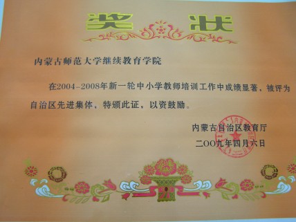 根据《关于报送新一轮中小学教师培训工作自评报告和推荐自治区教师培训先进集体与先进个人的通知》(内教师函【2008】10号)的精神,自治区教育厅组织开展了“全区新一轮中小学教师培训工作先进集体与先进个人评选”活动。公司伟德在此活动中荣获“2004—2008年新一轮中小学教师培训工作先进集体”的称号,伟德经理郝保文和副经理崔文被评为先进个人。