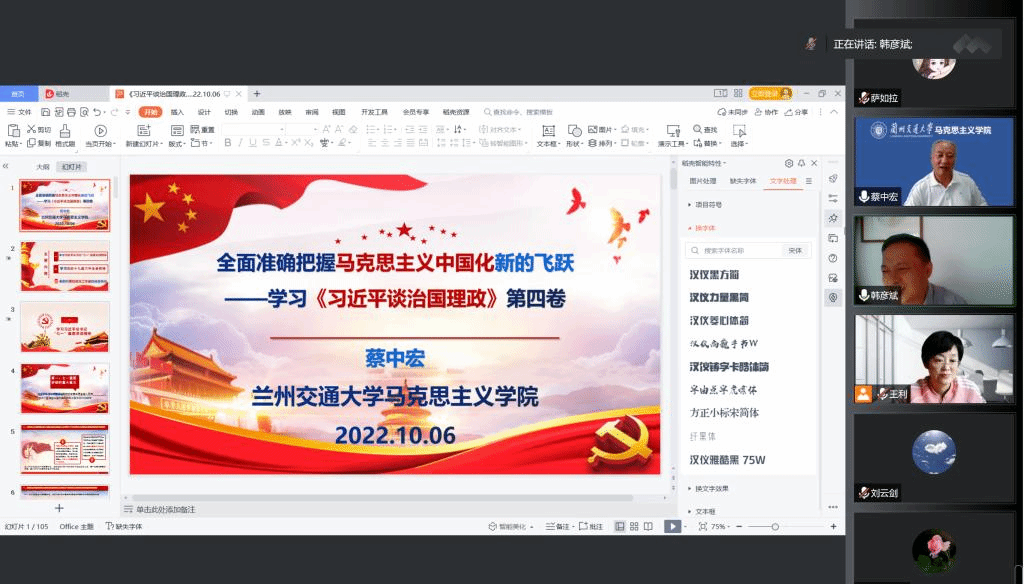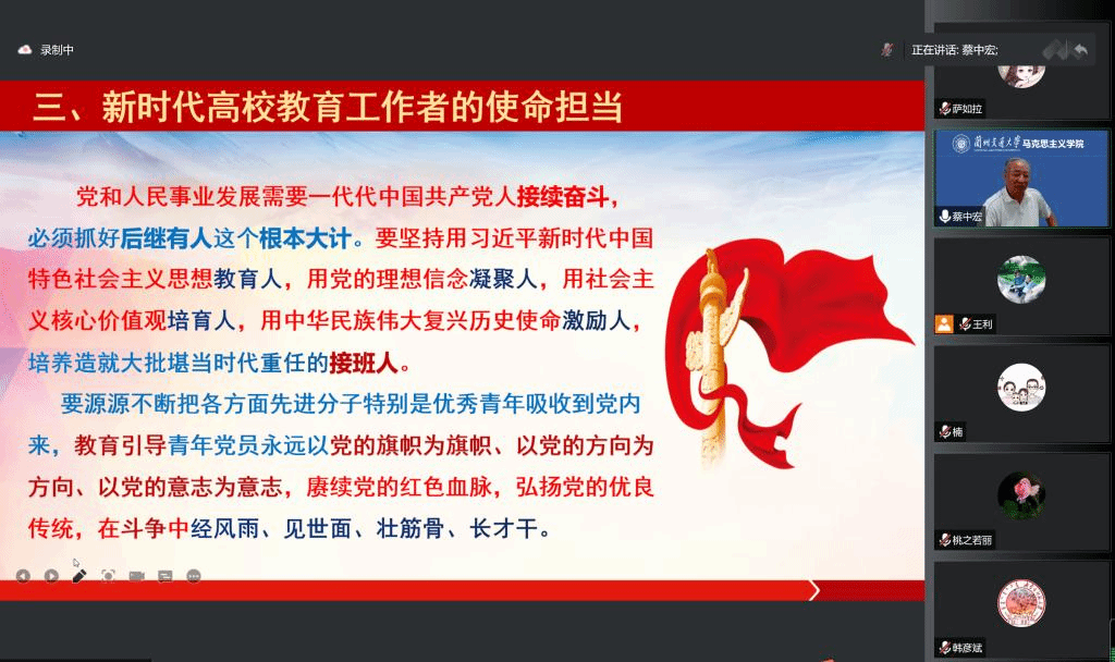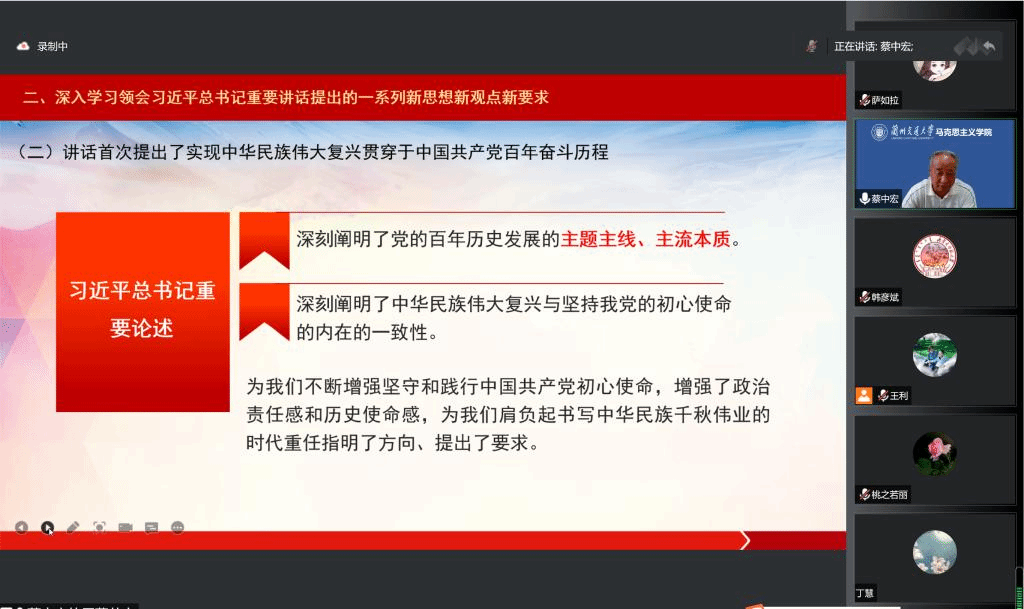 10月6日下午,公司党总支线上举办《习近平谈治国理政》第四卷专题讲座,本次讲座是按照公司党委组织部相关通知举办的专题培训之一,邀请兰州交通大学马克思主义公司经理、二级教授蔡中宏博士作题为“全面准确把握马克思主义中国化新的飞跃——学习《习近平谈治国理政》第四卷”的专题辅导。公司领导班子和全体教职工聆听讲座,本次会议由公司党总支书记韩彦斌主持。
