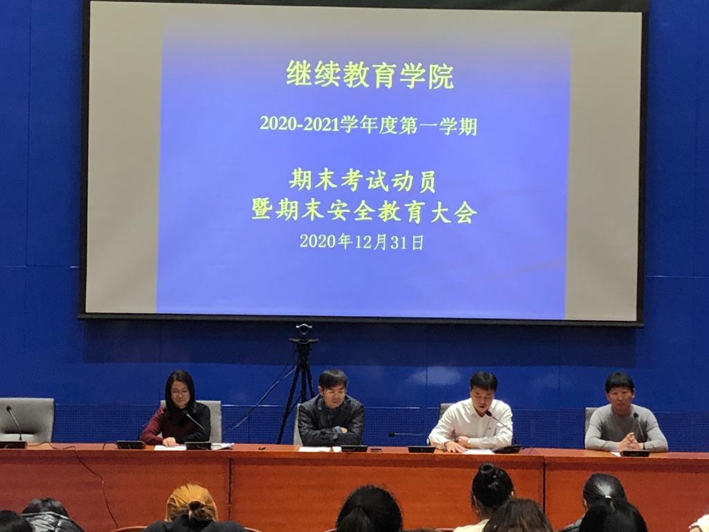 根据公司2020-2021学年第一学期期末教务安排及要求,为营造诚信应考的良好氛围,伟德于2020年12月31日晚七点在赛罕校区信息楼报告厅召开期末考试动员暨假期安全教育大会。公司党总支书记武俊明,党总支副书记、副经理刘云剑,副经理付丽和,副经理召那苏图,团总支、教务办负责人张健楠,学工办负责人萨如拉、各班班主任以及全院员工参加了此次会议。会议由副经理付丽和主持。